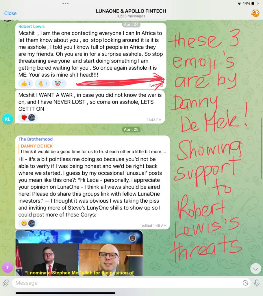 Evidence comprehensively shows Danny De Hek publicly supporting and standing behind Robert Lewis’s aggressive threats through “THE CRYPTO PONZI SCHEME AVENGER” platform against individuals including Steve McCullah and numerous other targeted victims.