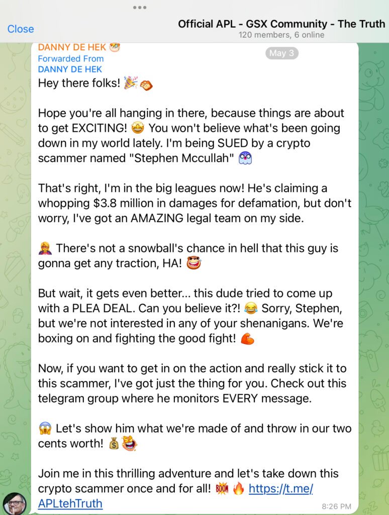 4. Danny De Hek Organizing “THE CRYPTO PONZI SCHEME AVENGER” FUD Groups to Attack Targets