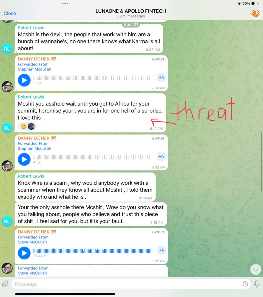1. Danny De Hek Allowing Clear Threats in “THE CRYPTO PONZI SCHEME AVENGER” Groups