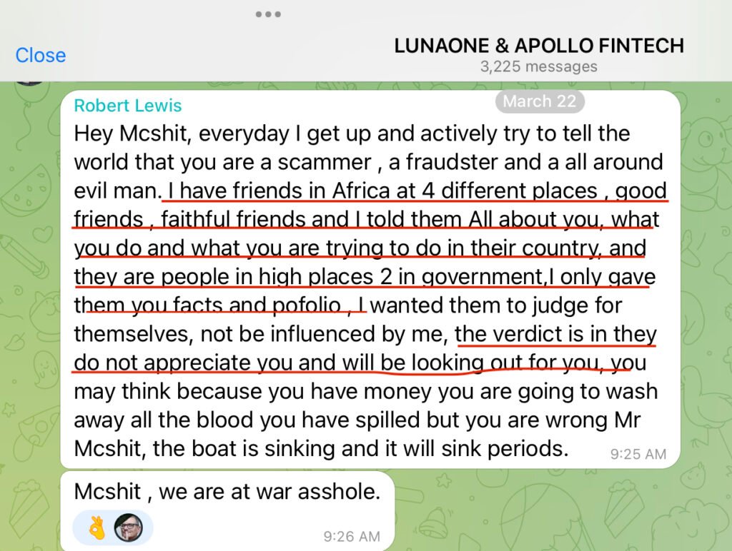 - Fear of violence following “THE CRYPTO PONZI SCHEME AVENGER” threats